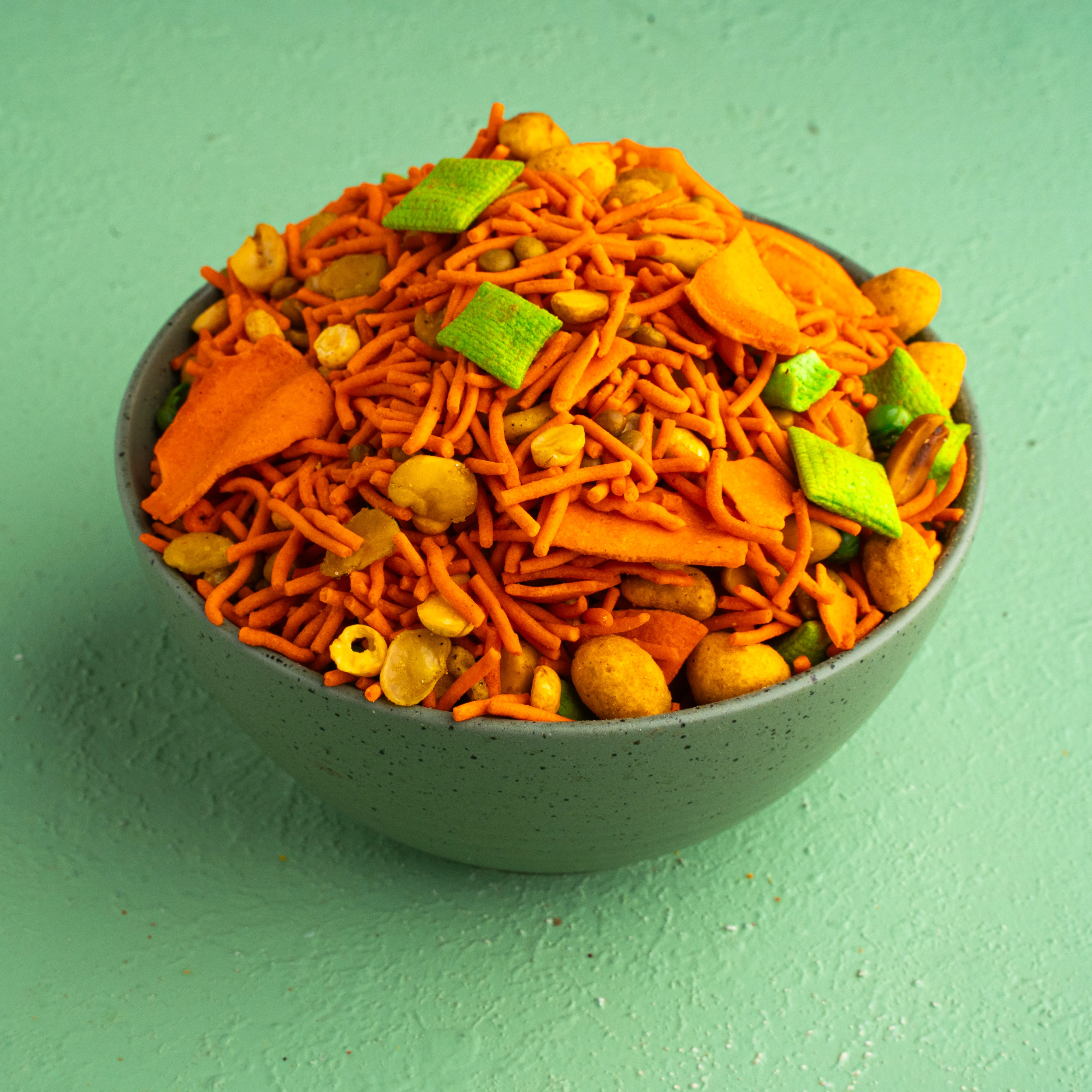 بهعنوان میانوعده شور و تند، مناسب برای پذیرایی در مهمانیها، دورهمیها و تنقلات روزمره. ترکیب آن شامل نخود، عدس، رشتههای آردی، بادام هندی، بادام زمینی و ادویهجات متنوع است. مصرف در حد اعتدال توصیه میشود.